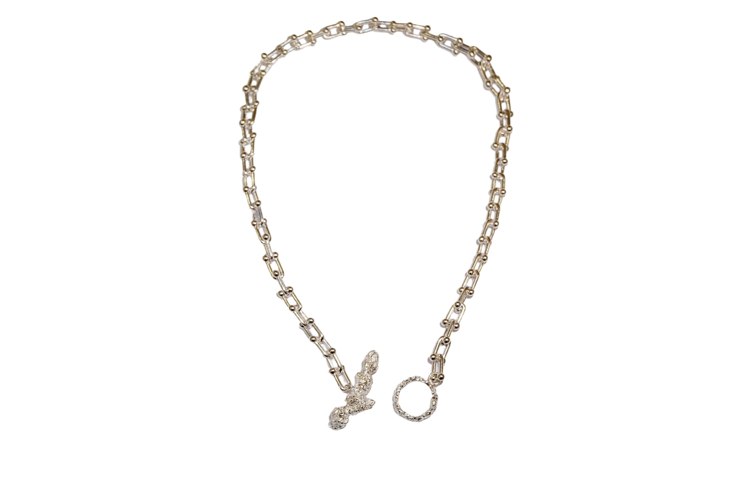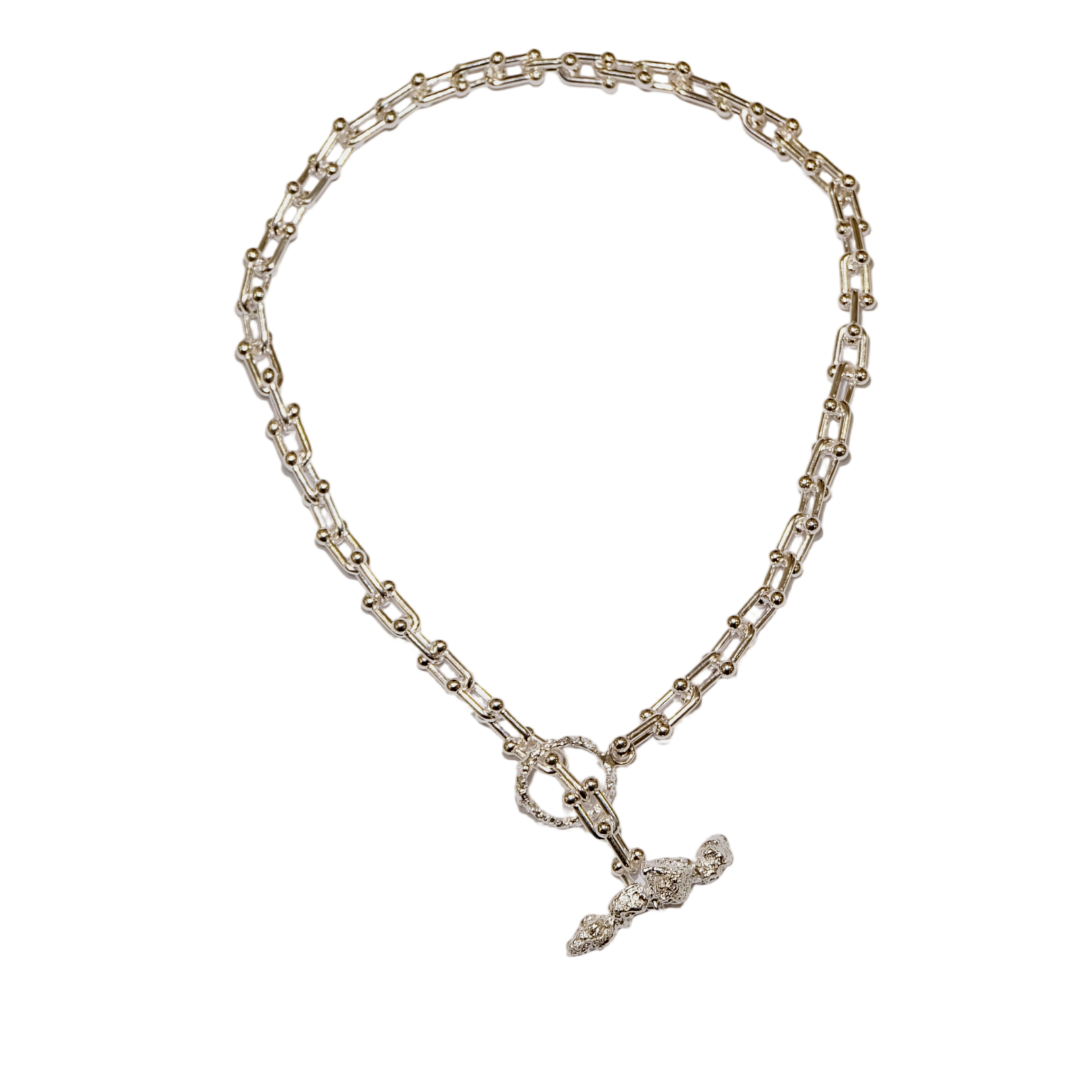 The chain is anchored by a volcanic-inspired clasp, its texture contrasting with the rhythm of the links.