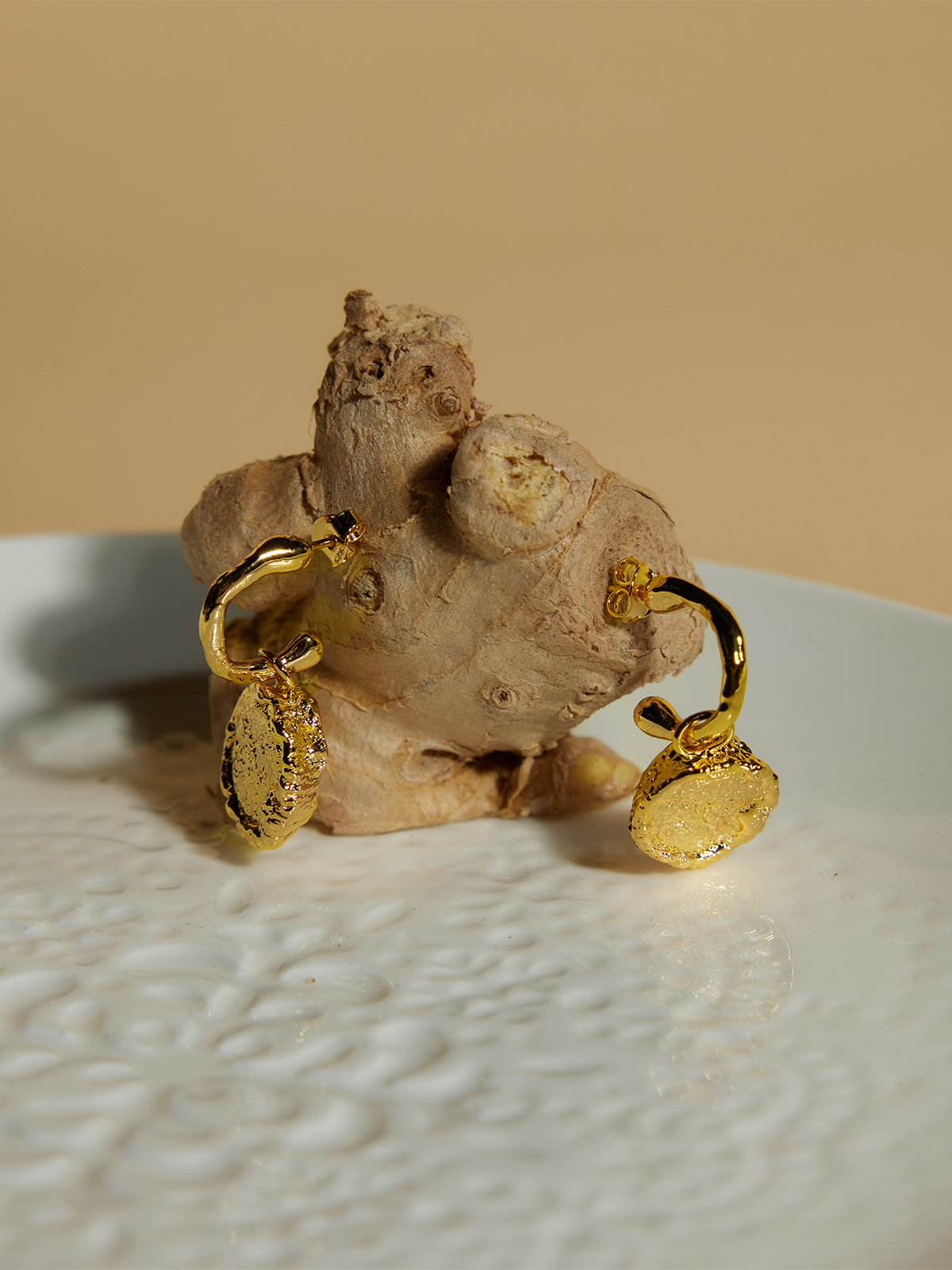 Shaped from the irregular outline of ginger, these drop earrings embrace natural asymmetry and organic flow.