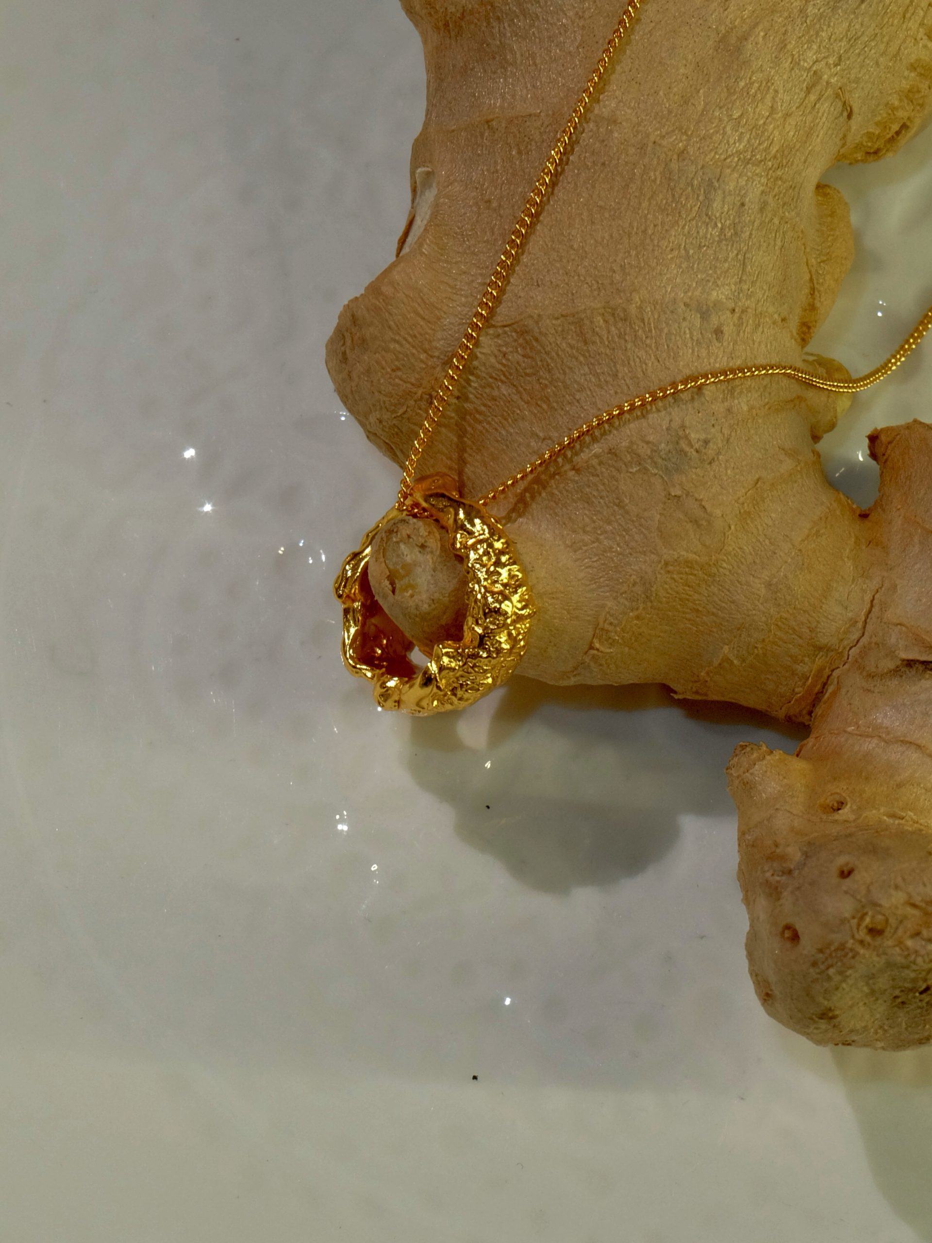The texture is inspired by the organic form of real ginger, interpreted into metal with its natural ridges and curves preserved.