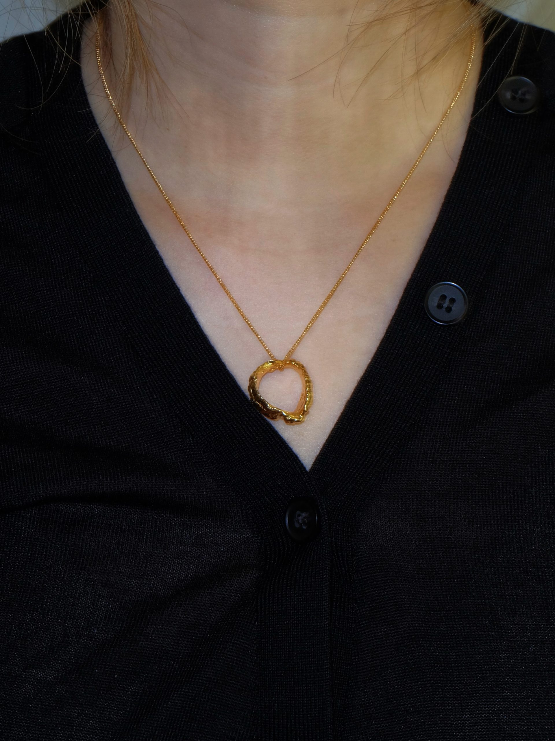 Formed from the textured surface of ginger skin, this open-loop pendant preserves every natural ridge and grain. A sculptural expression of protection and grounded energy, celebrating the quiet beauty found on the surface of nature.