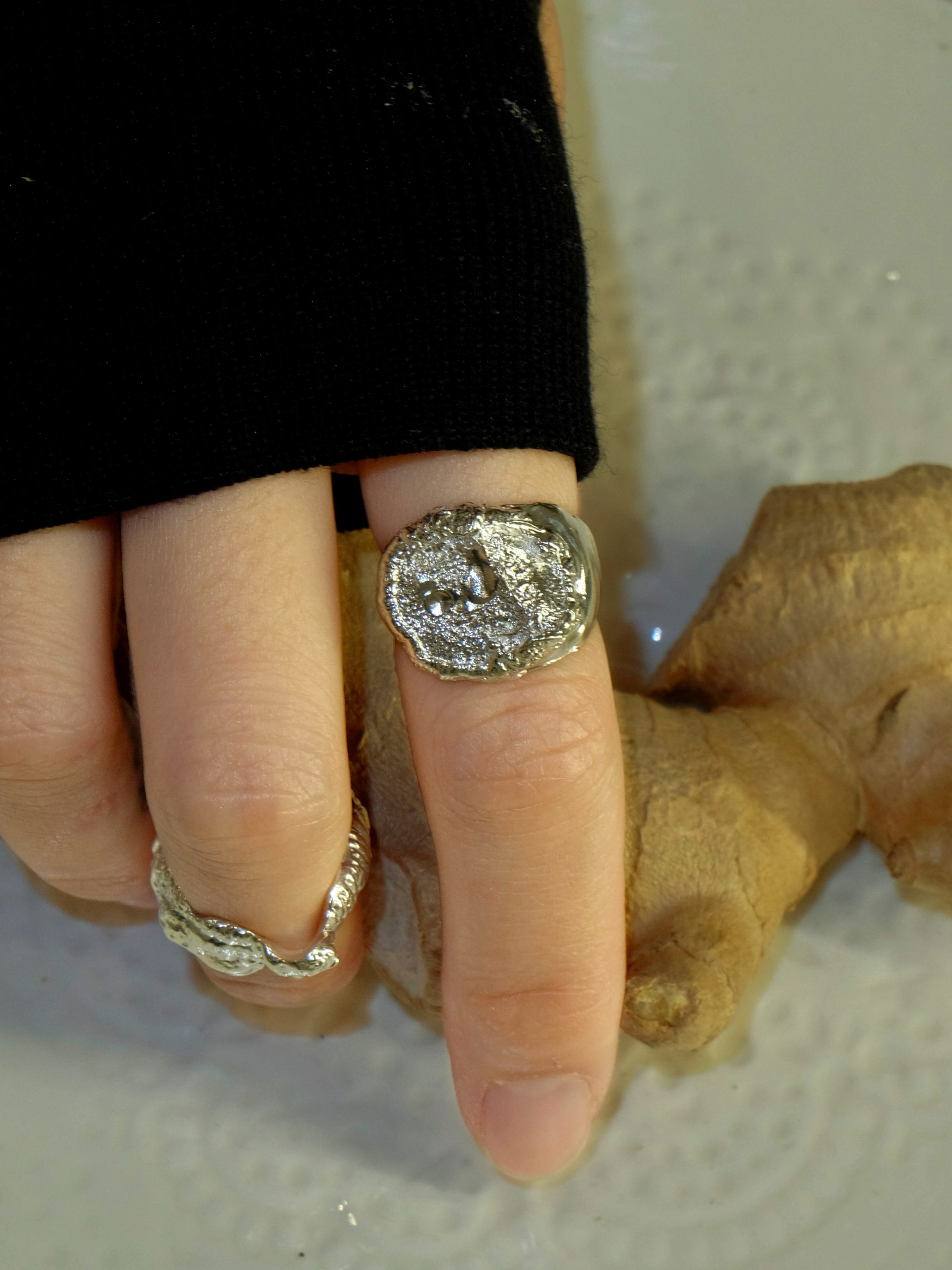The texture is inspired by the organic form of real ginger, interpreted into metal with its natural ridges and curves preserved.