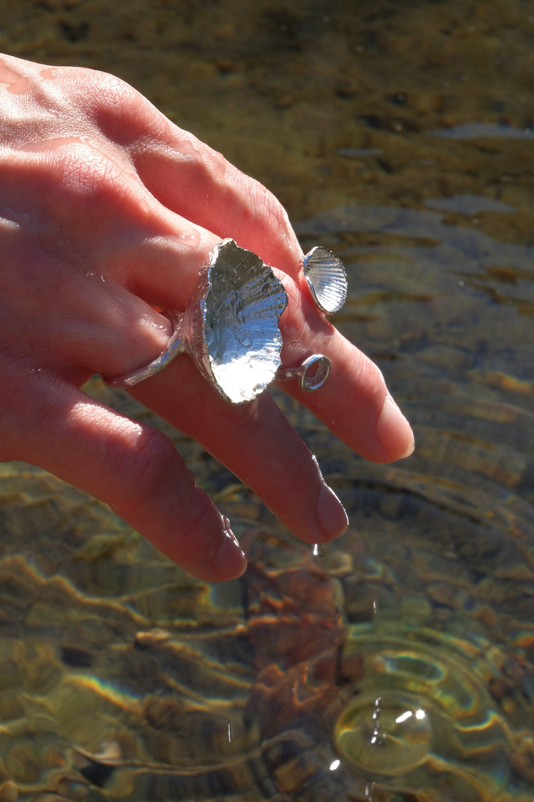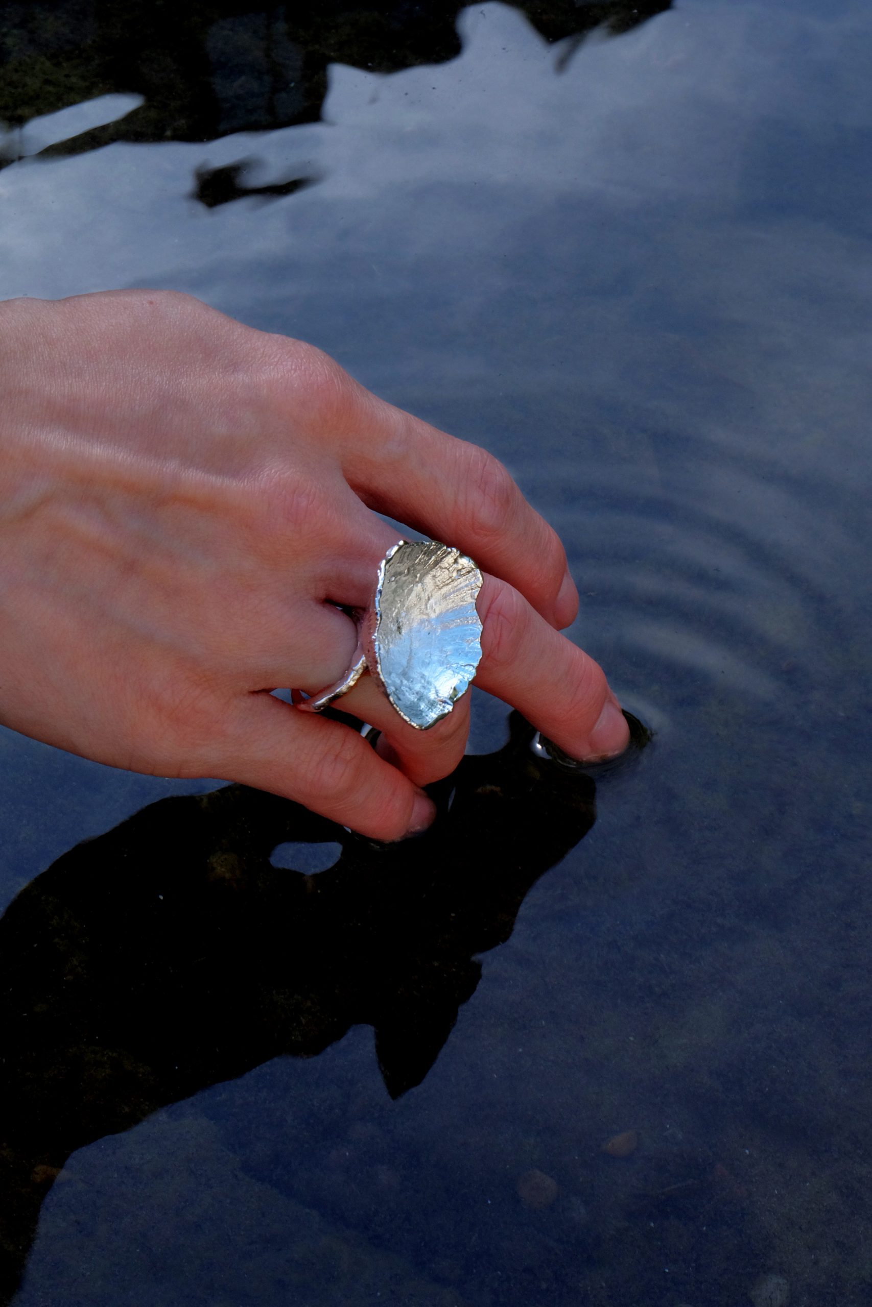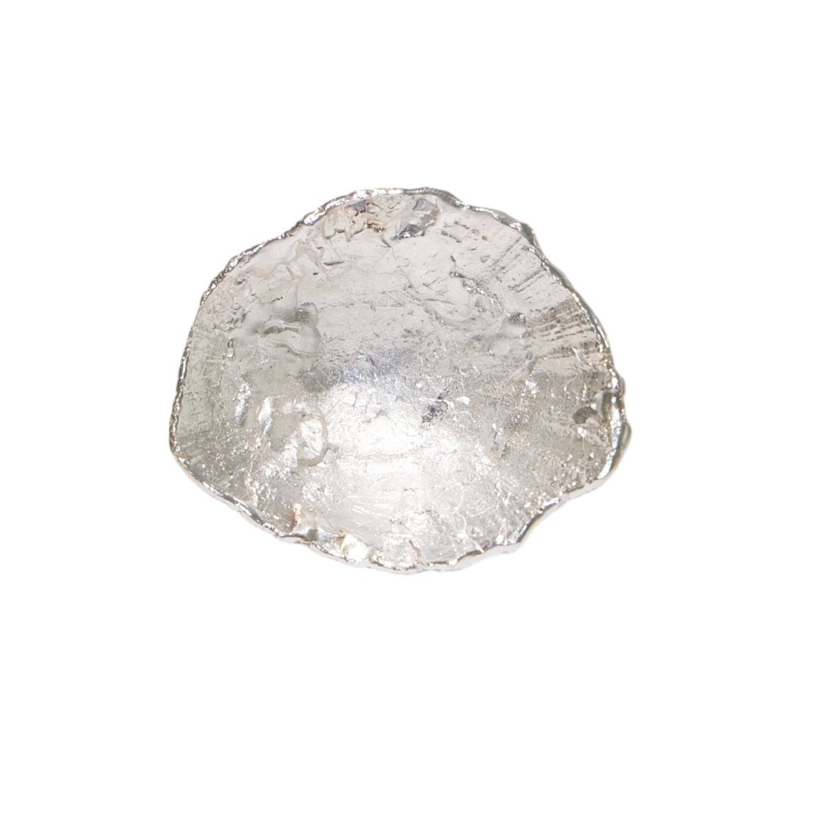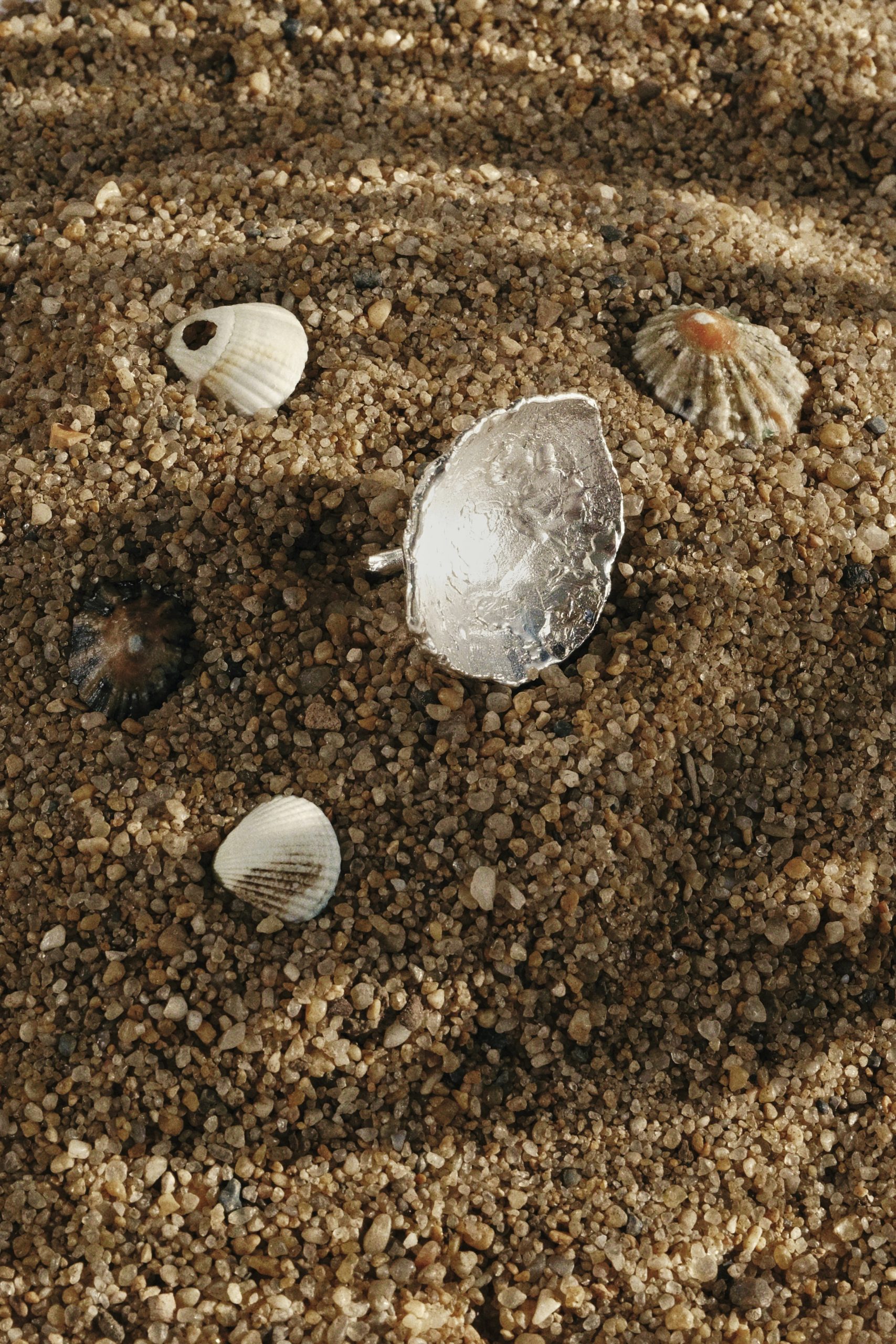 The texture is inspired by real shells collected along the Folkestone coastline near London, translated into metal with their natural irregularities preserved.