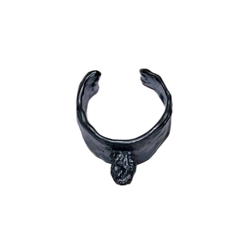The ring resembles a fragment lifted directly from volcanic terrain, its form compact yet irregular.
