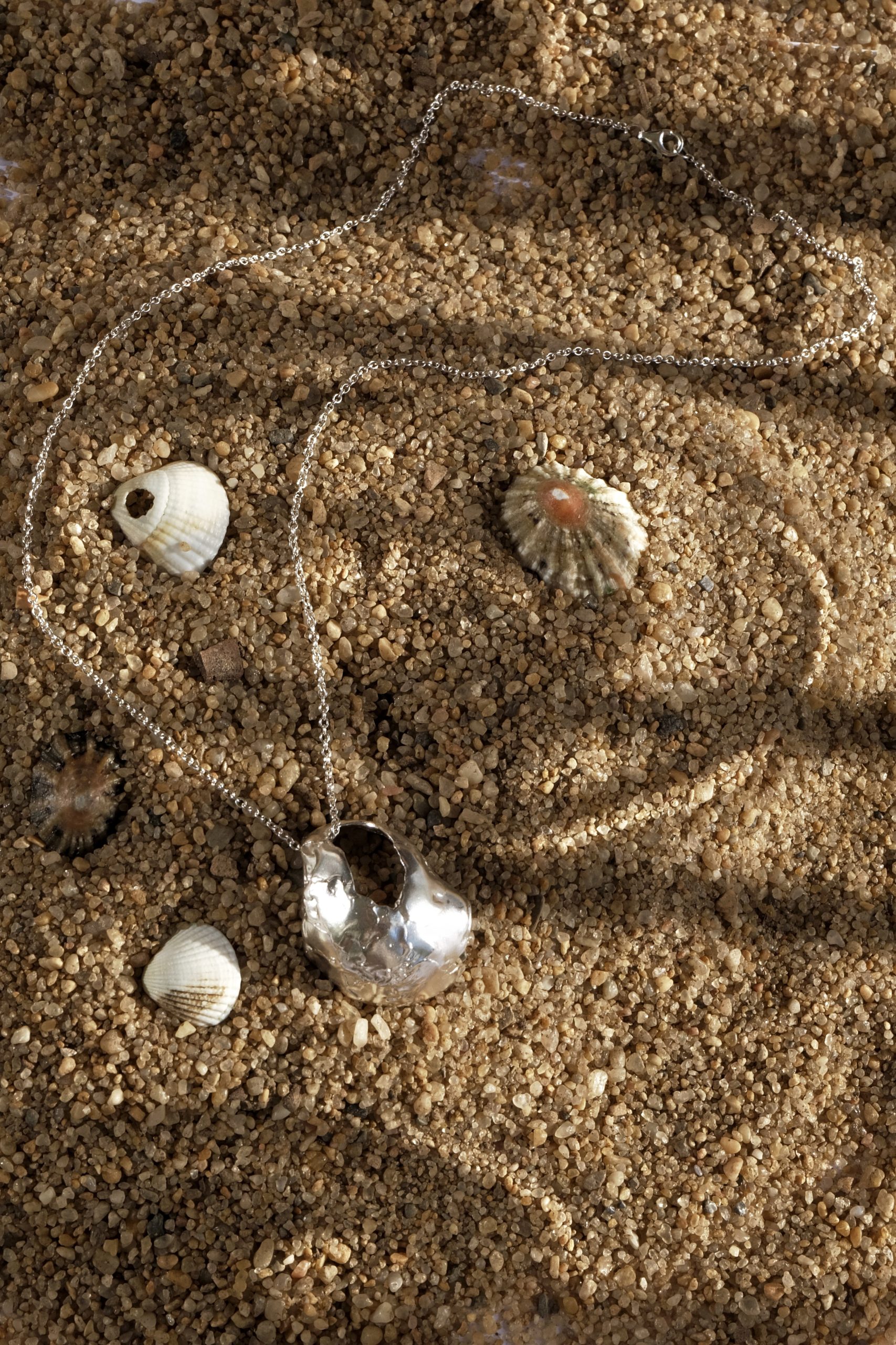 The texture is inspired by real shells collected along the Folkestone coastline near London, translated into metal with their natural irregularities preserved.